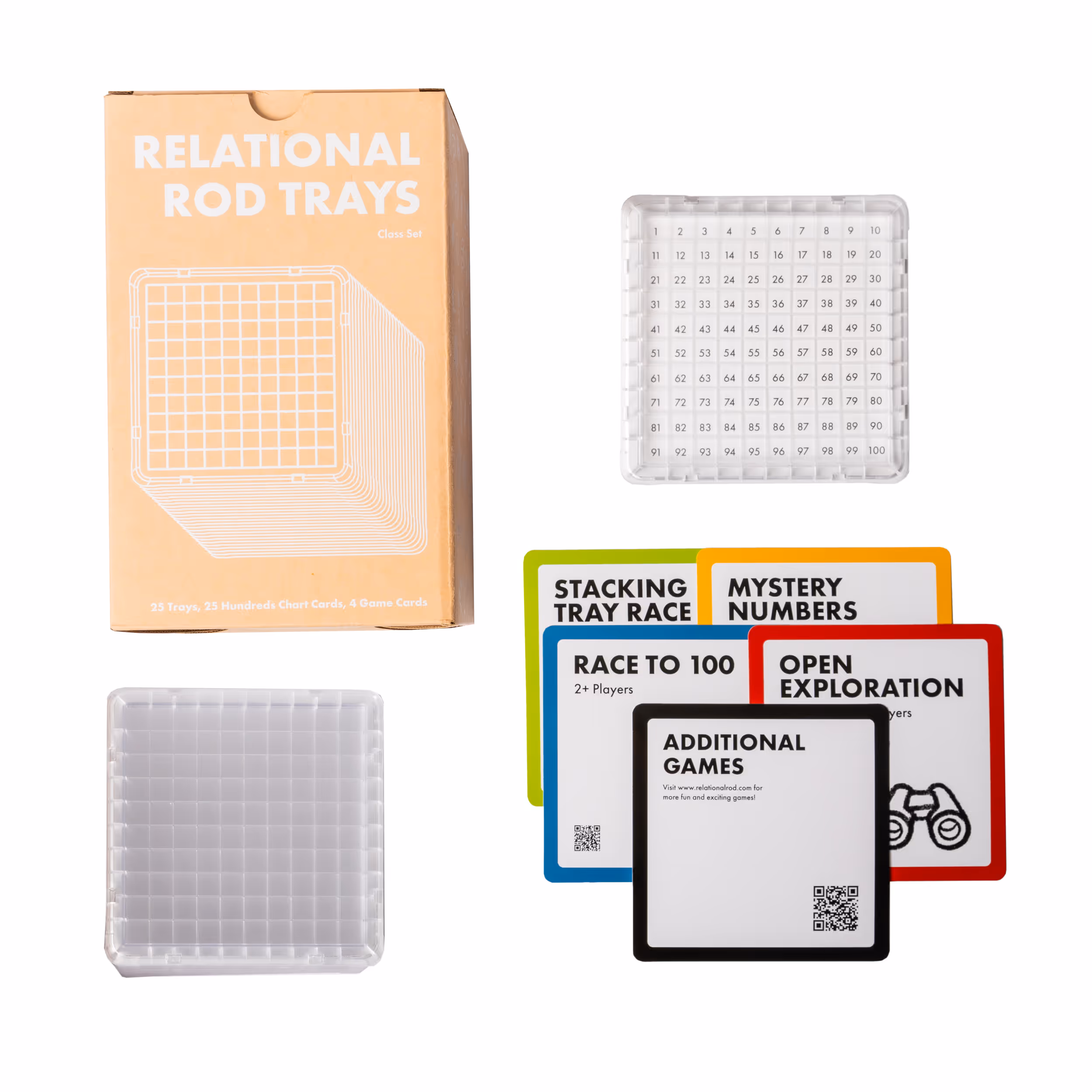 Educators have been using Cusinaire rods with paper 'hundreds charts' for years, however they come with their own set of challenges: they don't always print exactly 10cmx10cm so rods don’t fit, young students don't always understand where the edges of the hundreds chart are, and treating this paper as disposable adds up to a waste over the years! We designed and manufactured a low-cost, impact resistant, injection molded Relational Rod Tray that fit Cuisenaire-style Rods. They include swappable card inserts, catering to a variety of teaching styles. Some educators want a blank tray, a counting up hundreds chart tray, a counting down hundreds chart tray, and a customizable hundreds chart tray. Relational Rod Trays support the development of number sense through the exploration of mathematical concepts such as relationships between numbers, composing and decomposing numbers, working with patterns, additive reasoning, square numbers, properties of odd/even numbers, fractions, measuring, symmetry, and many more!